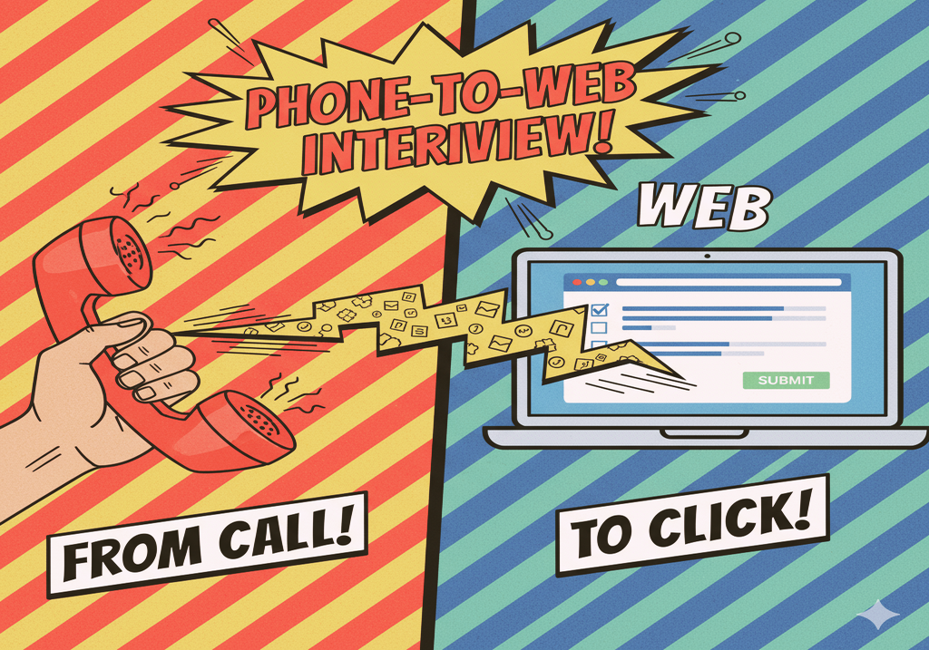 A modern spin on telephone surveys, our Phone-to-Web approach guides respondents through online surveys in real time. Ideal for tech-shy groups, elderly audiences, or complex designs, it lifts completion rates and ensures data stays accurate and clean.